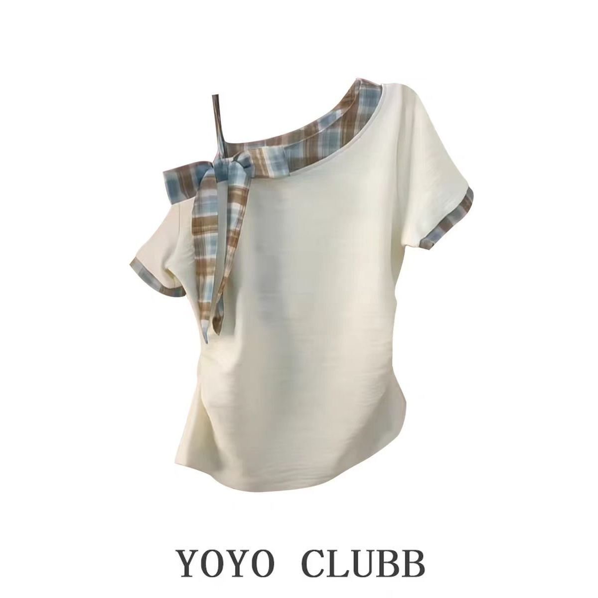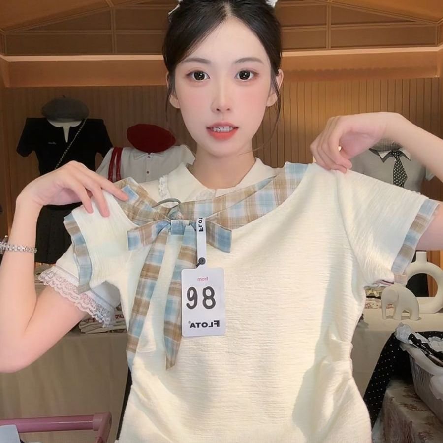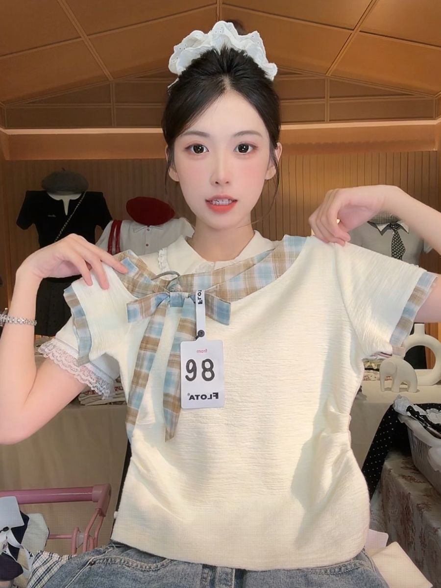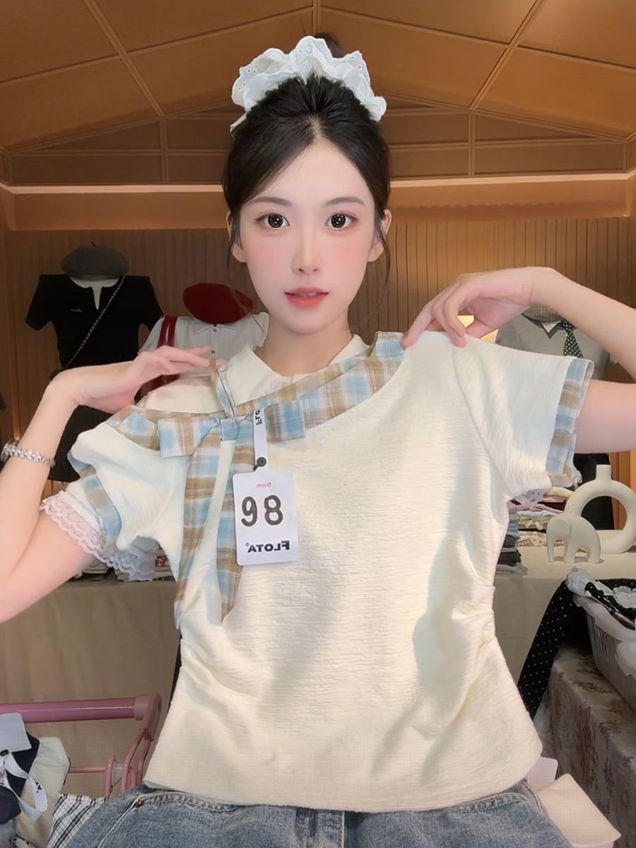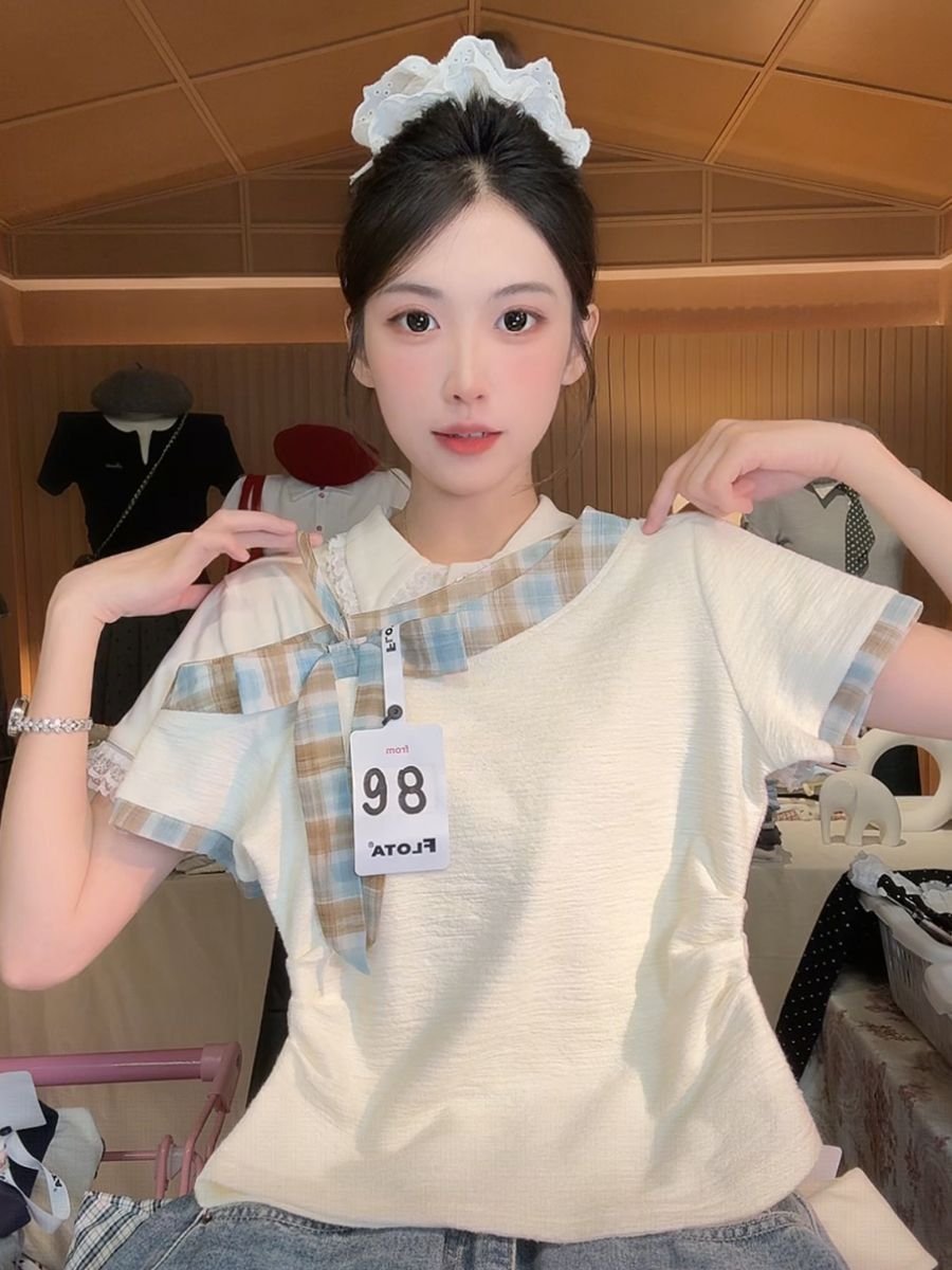 Sweet and spicy plaid contrast diagonal short-sleeved T-shirt women’s summer retro bow waist slimming pleated cropped top