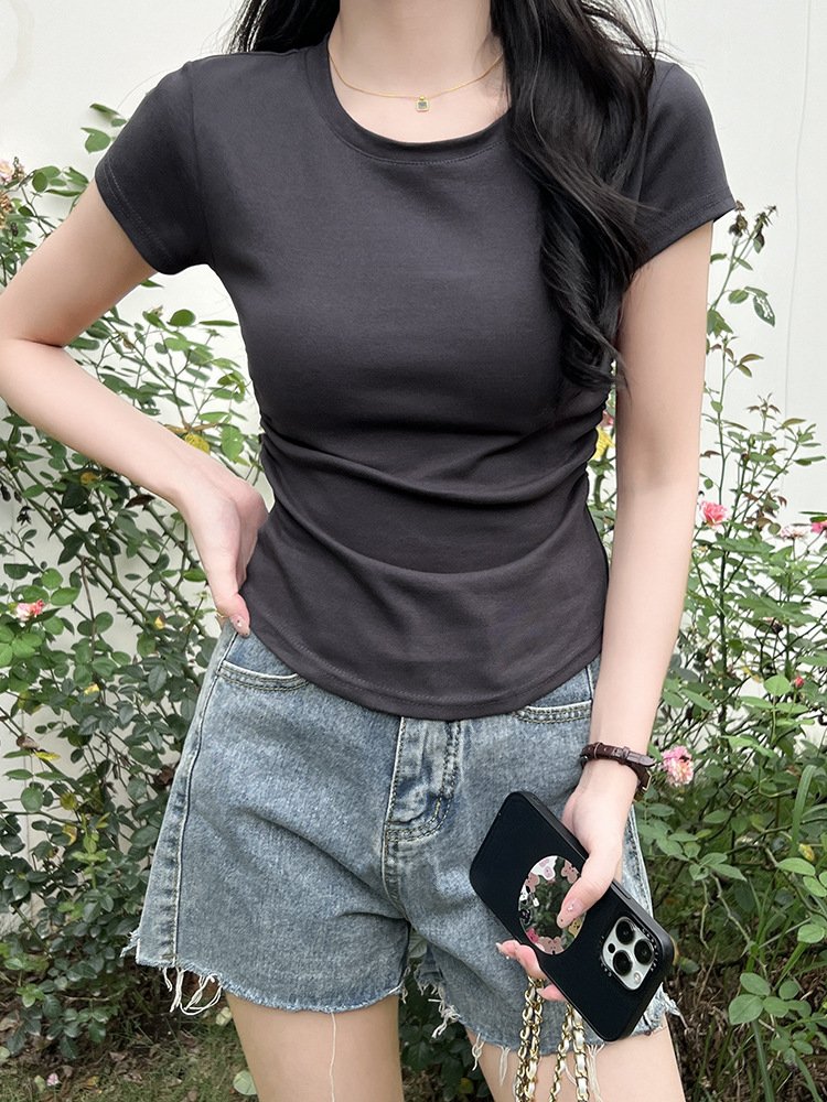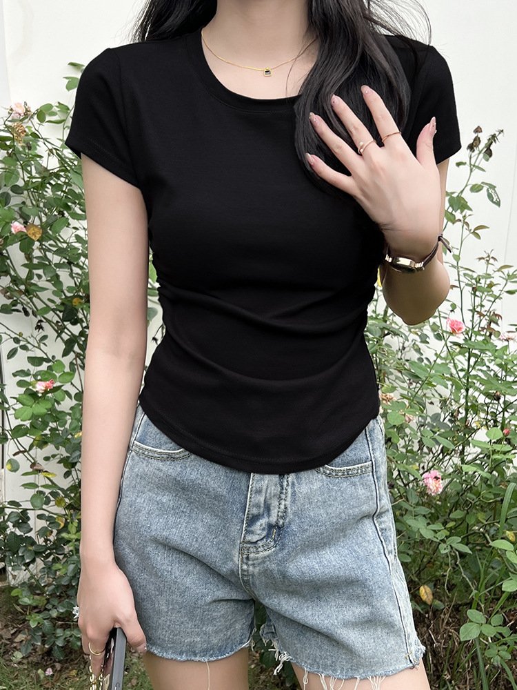 The design style is niche, straight shoulders, cotton crew neck, short-sleeved T-shirt, women’s summer showy, short waist, slender and versatile