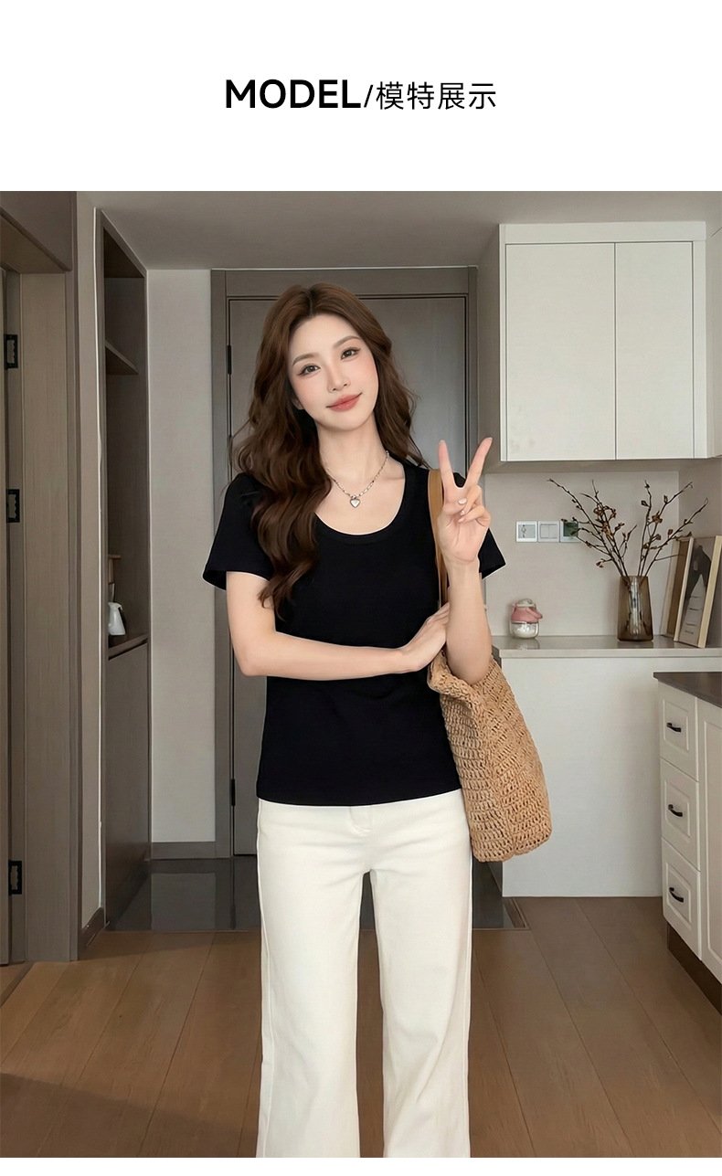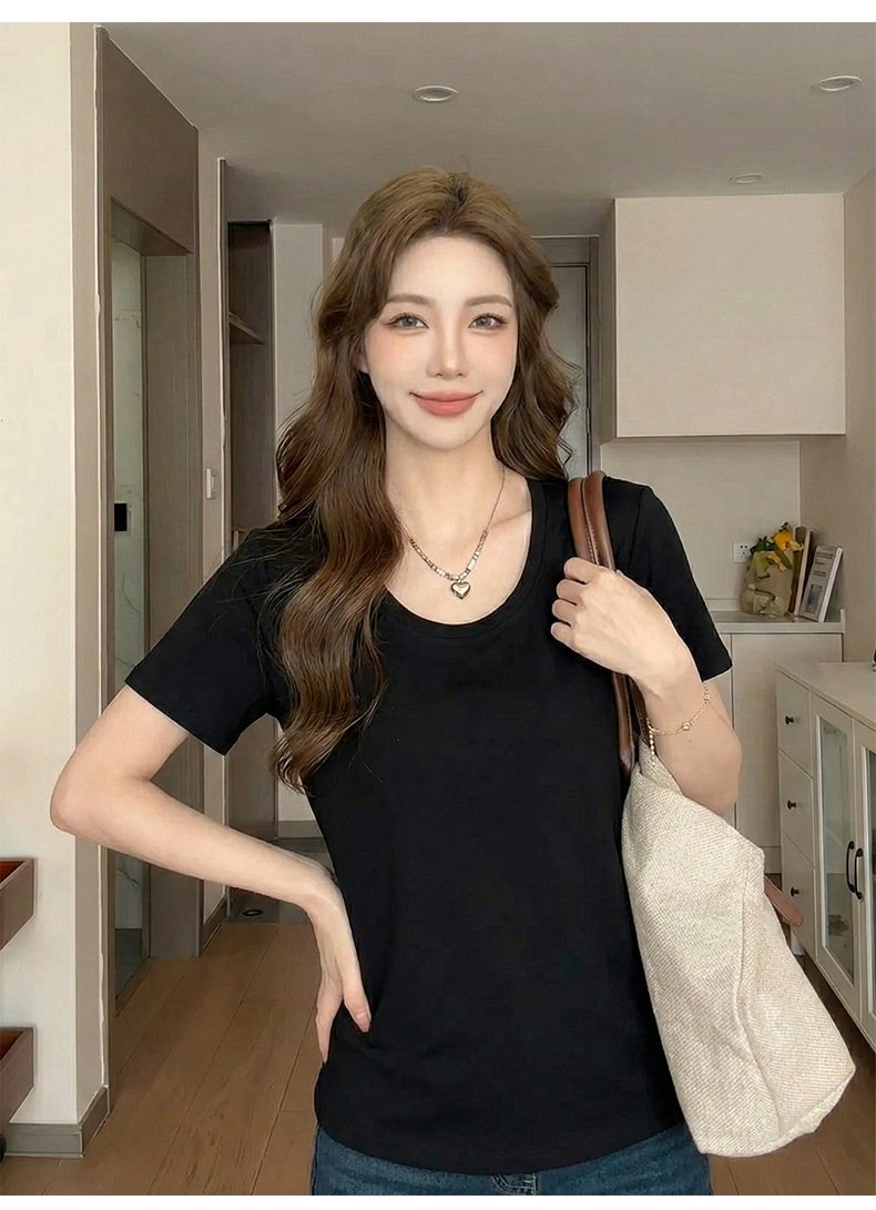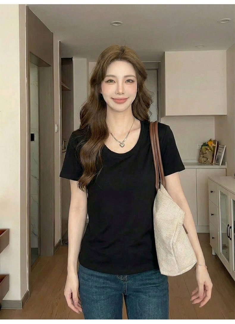 • Spring Korean top, women's short-sleeved T-shirt, pure cotton, loose and slimming, inner base layer, dopamine pink women - Black Black