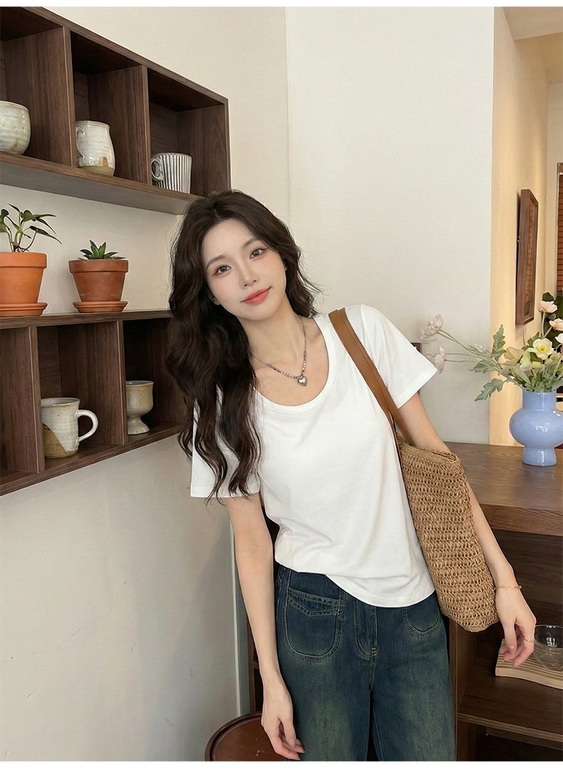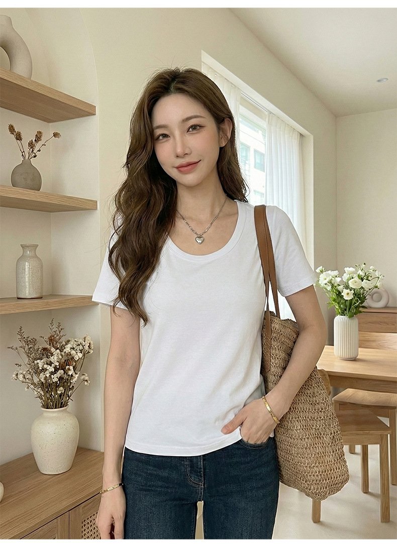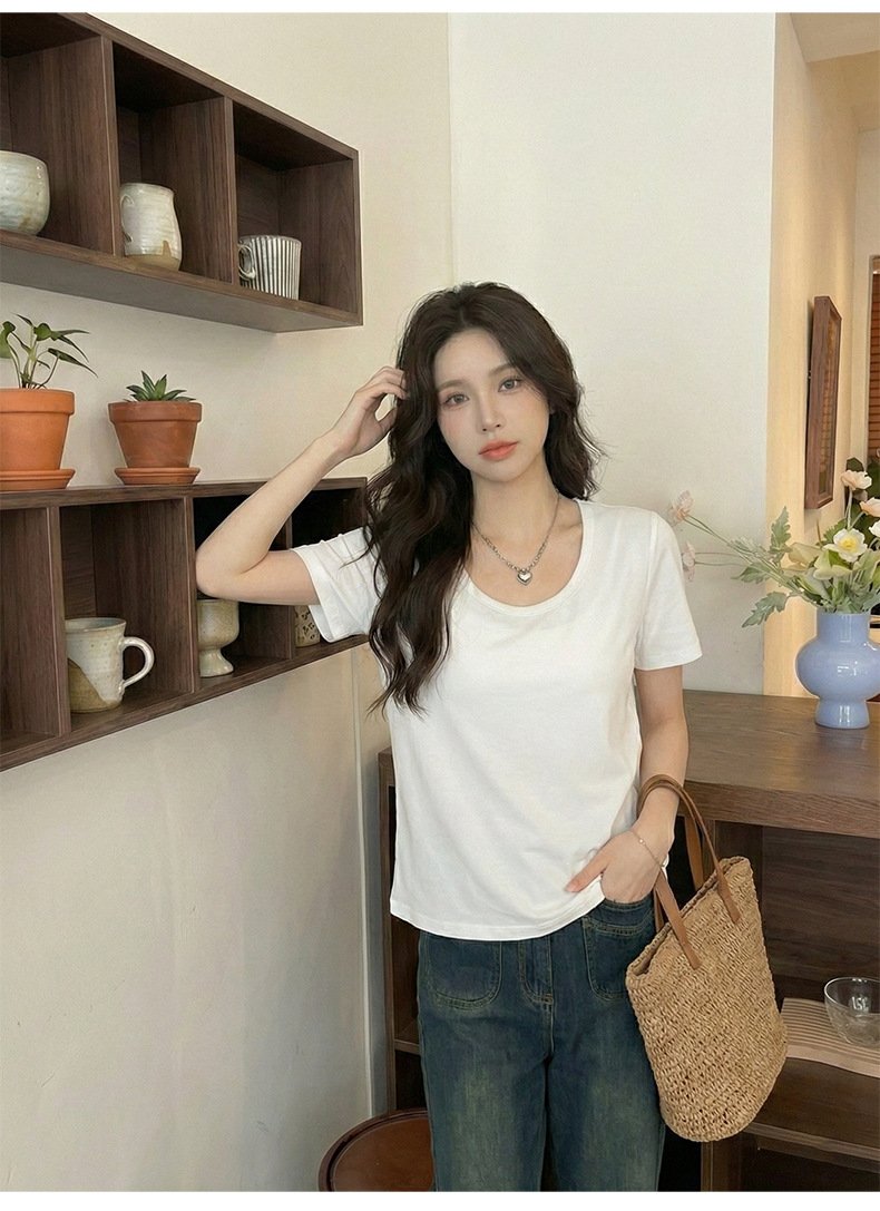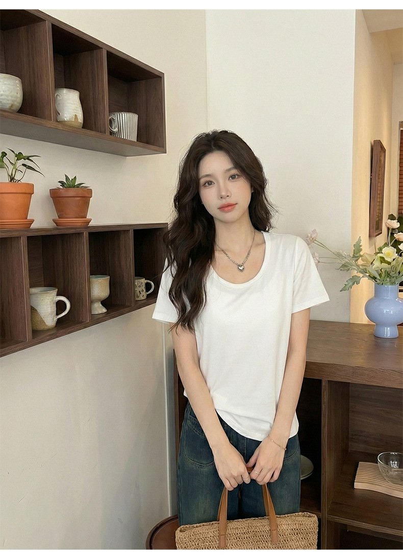 • Spring Korean top, women's short-sleeved T-shirt, pure cotton, loose and slimming, inner base layer, dopamine pink women - White White